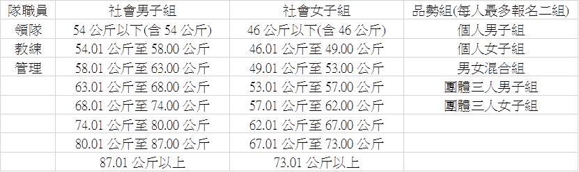 若主辦之比賽欲使用本線上報名系統進行報名作業,請聯絡羅文祥教練,並提供比賽組別量級的EXCEL檔(若品勢比賽則是組別段位),格式如下圖所示