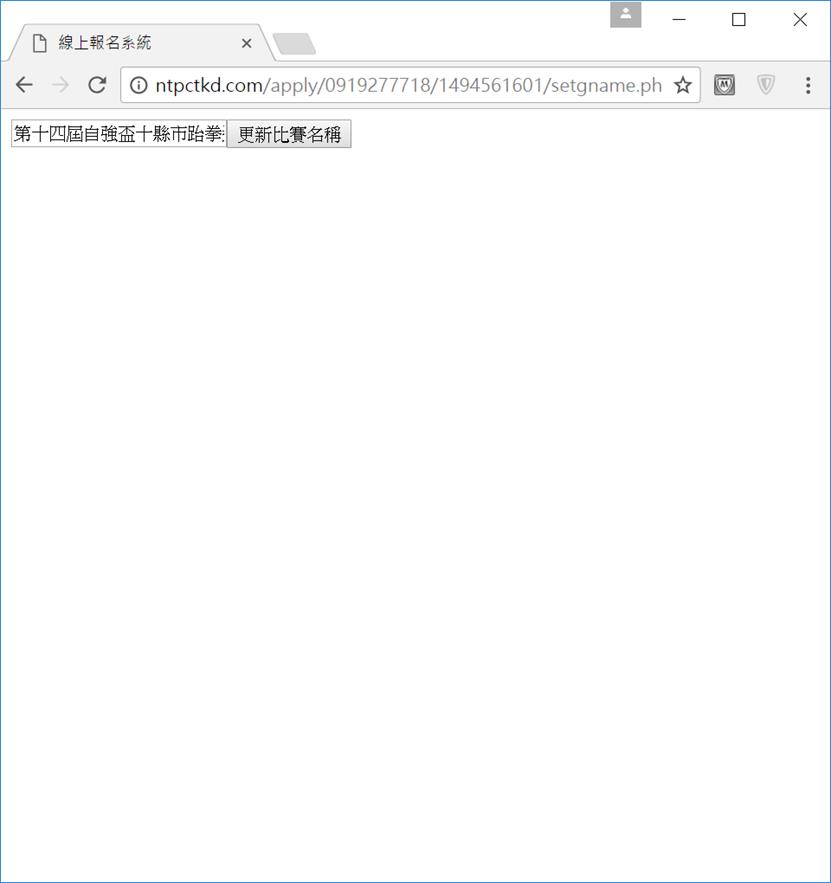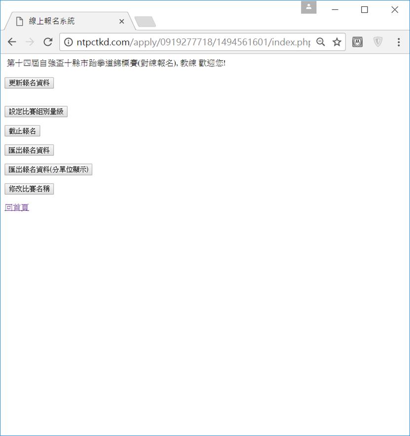 進入自己主辦的比賽,除了可以更新報名資料外,還比一般使用者多了設定比賽組別量級、截止(以及開放)報名、匯出報名資料、匯出報名資料(分單位顯示)、修改比賽名稱等主辦者功能