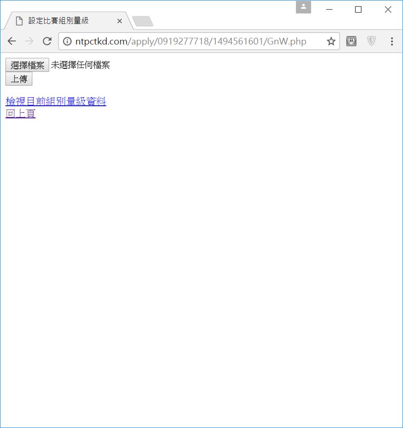 點選檢視目前組別量級資料就能夠下載目前組別量級(若品勢比賽則是組別段位)的EXCEL檔,在電腦上將EXCEL檔修改好之後儲存,選擇新存的檔案再點上傳,就完成了比賽組別量級的更新
