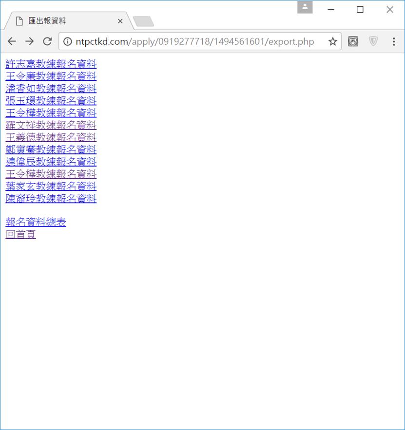 點選匯出報名資料便可看到所有報名之教練的報名資料,也可以匯出報名資料總表的EXCEL檔